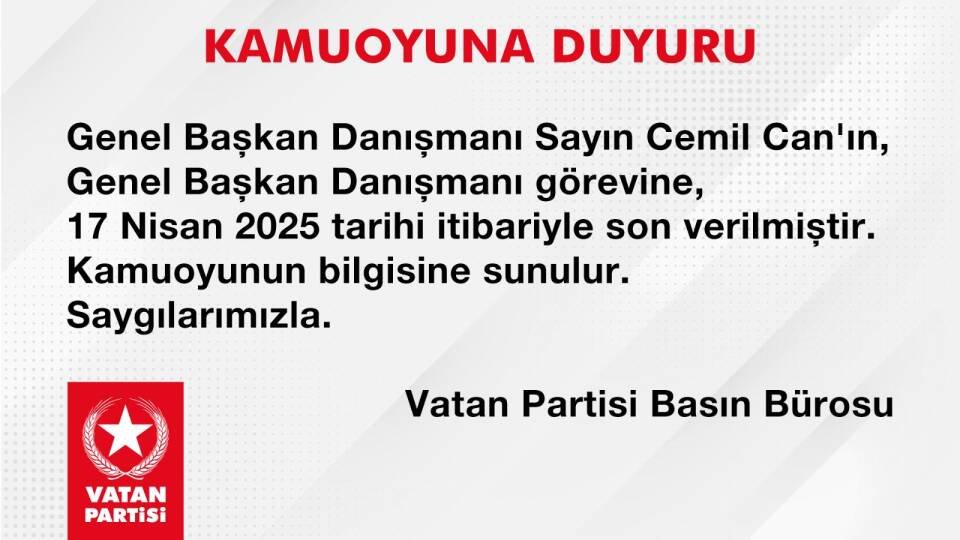 Genel Başkan Danışmanı Sayın Cemil Can’ın, Genel Başkan Danışmanı görevine, 17 Nisan 2025 tarihi itibariyle son verilmiştir. Kamuoyunun bilgisine sunulur. Saygılarımızla.