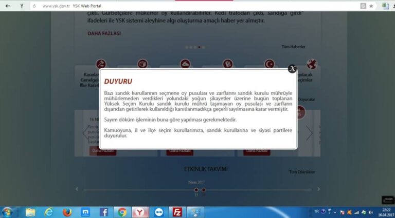 1- Kurulunuz Başkanı Sayın Sadi Güven’in 16 Nisan 2017 akşamı basına ve kamuoyuna yaptığı açıklamada ve Kurulunuzun resmi internet sitesindeki duyurusunda da kabul edildiği gibi Halk oylamasında, üzerinde sandık kurulu mührü taşımayan zarfların ve oy pusulalarının kullanıldığı sabit olmuştur.