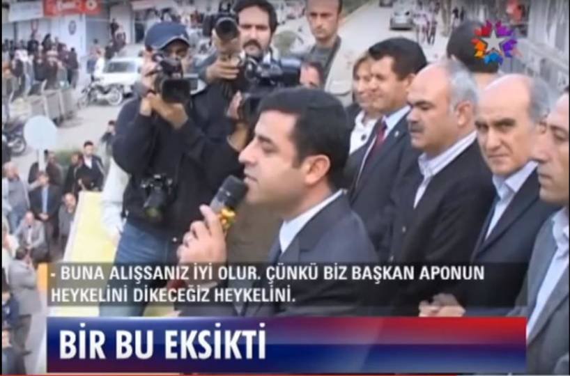 “Demişler ki ‘Öcalan posteri açamazsınız’. Bak onu diyenlere açıkça sesleniyorum: Bu halk için 14 yıldır İmralı’da bir beton çukurda direnen Kürt halk önderinin posterini Kürdistan’a asamayacak da nereye asacak bu halk? Buna alışsanız iyi olur. Çünkü biz Başkan Apo’nun heykelini dikeceğiz heykelini!”